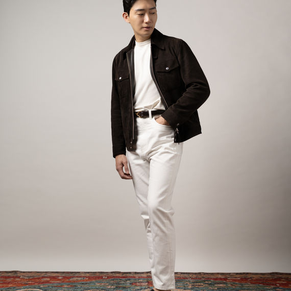 Safari Jackets in Linen Blends and Suede Leather Jackets made from Lamb Skin are easy to throw on to elevate a casual look.